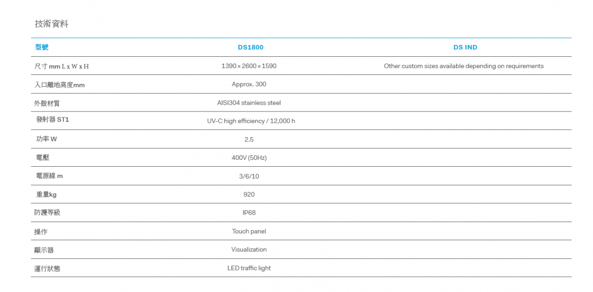 DS1800紫外線通道式殺菌系統用於清除托盤、容器、桶和大型包裝表面上的有害微生物,同時可作為準備室和加工室之間的全面潔淨室。