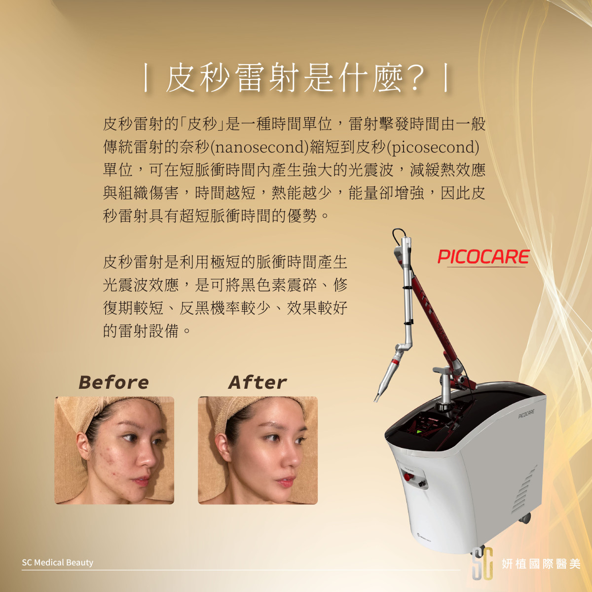 皮秒是一種時間單位,1皮秒為 (10⁻¹²秒)=1/1000000000000秒,所以相較於傳統雷射大幅減少雷射熱能停留在肌膚的時間,因此破壞力較小、反黑副作用機率較低,術後恢復期也更短。?