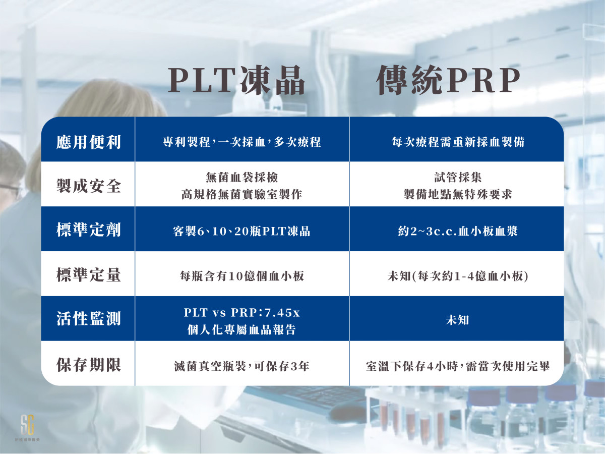 PRP(全名Platelet-rich plasma)是傳統純化血小板的方式,目前仍廣為使用。過去PRP技術在每次療程中需要重新抽取血液,再加上濃度無法精準測量以及保存不易,在使用上有諸多不便。而PLT凍晶為新型態血小板精煉技術,從PRP中萃取小於1%之最有效成分,比PRP生長因子高5~8倍,使用上也更加便捷不受限制。